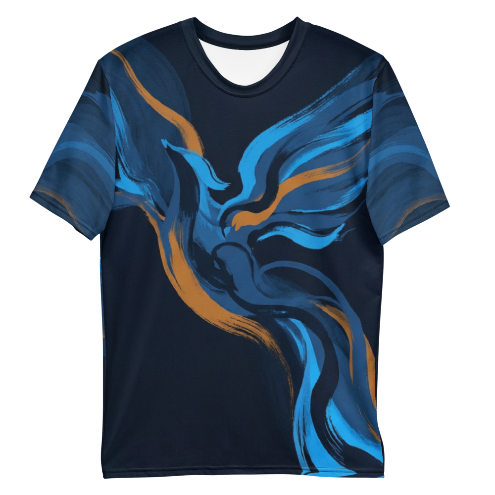 Dieses außergewöhnliche T-Shirt präsentiert ein meisterhaftes, abstraktes Design, das die majestätische Form eines Adlers im Flug einfängt. Auf einem tiefen, nachtblauen Hintergrund entfaltet sich das Motiv durch dynamische, schwungvolle Pinselstriche. Leuchtendes Cyan, kräftiges Mittelblau und markante kupferfarbene Akzente verschmelzen zu einem energiegeladenen Kunstwerk auf der Vorderseite. Die Rückseite greift diese fließende Ästhetik mit sanft geschwungenen, wellenartigen Linien im unteren Bereich elegant wieder auf und vollendet das harmonische Gesamtbild.