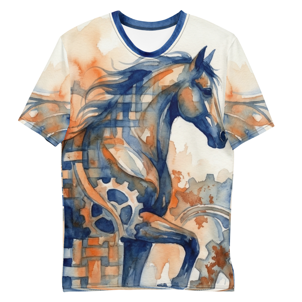 Tauche ein in eine Welt, in der organische Kraft auf mechanische Präzision trifft. Dieses außergewöhnliche Design zeigt das majestätische Profil eines Pferdes, das kunstvoll mit filigranen Zahnrädern und fließenden, wellenartigen Formen verschmilzt. Die meisterhafte Aquarell-Optik besticht durch eine atemberaubende Farbpalette: Tiefe, satte Blautöne fließen nahtlos in warme, rostige Kupfer- und Orangenuancen über. Zarte Farbspritzer und ineinandergreifende, gitterartige Strukturen verleihen dem Motiv eine unvergleichliche Tiefe und Dynamik, die sofort ins Auge fällt. Dieses ausdrucksstarke Kunstwerk ist perfekt für alle, die das Außergewöhnliche suchen und ihre Leidenschaft für Tiere mit einem Hauch von Steampunk-Ästhetik verbinden möchten. Egal ob beim entspannten Stadtbummel, auf dem nächsten Kunstfestival oder als markantes Statement-Piece im Alltag – dieses Design zieht bewundernde Blicke auf sich. Es richtet sich an Freigeister, Kunstliebhaber und Individualisten, die ihre Persönlichkeit durch einzigartige, visuell anspruchsvolle Mode zum Ausdruck bringen wollen. Mit einem Kauf bei isakum.com entscheidest du dich für exklusive Premium-Designs, die nicht an jeder Ecke zu finden sind. Unsere limitierten Kunstwerke werden mit höchster Sorgfalt kuratiert, um dir stets einen einzigartigen Look zu garantieren, der dich mit kreativer Brillanz von der Masse abhebt.