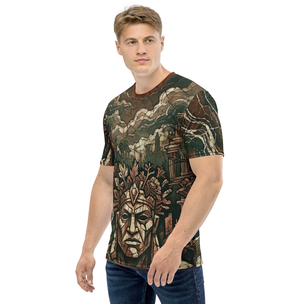 Tauche ein in die Welt vergessener Zivilisationen mit diesem atemberaubenden Design. Die Vorderseite präsentiert das majestätische, stoische Gesicht eines antiken Wächters oder Naturgeistes, gekrönt von stilisierten Blättern. Umgeben ist die Szenerie von verwitterten Ruinen, Säulen und dynamisch wirbelnden Wolken. Auf der Rückseite thront ein erhabenes, rissiges Wappen, eingebettet in organische Ranken und architektonische Überreste. Die gesamte Komposition ist im faszinierenden Stil eines antiken Mosaiks oder rissigen Freskos gehalten. Dominante Erdtöne wie tiefes Waldgrün, warmes Terrakotta, Kupfer und dunkles Braun verleihen dem Motiv eine unglaubliche Tiefe und eine mystische, erdverbundene Ausstrahlung.